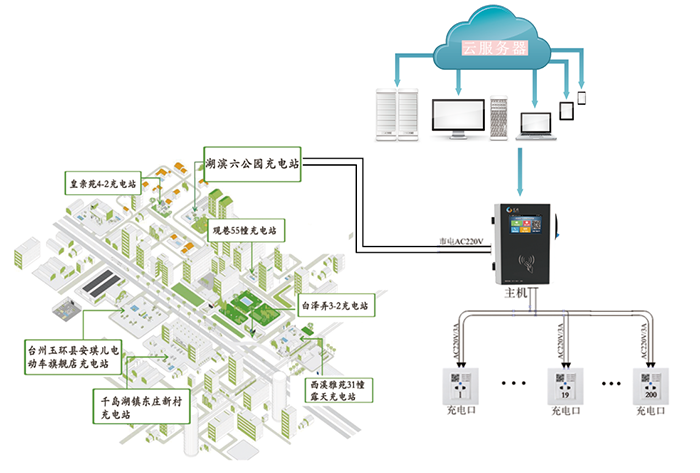 • 充電樁數(shù)量靈活配置(一臺(tái)主機(jī)可掛載5~200個(gè)充電樁)